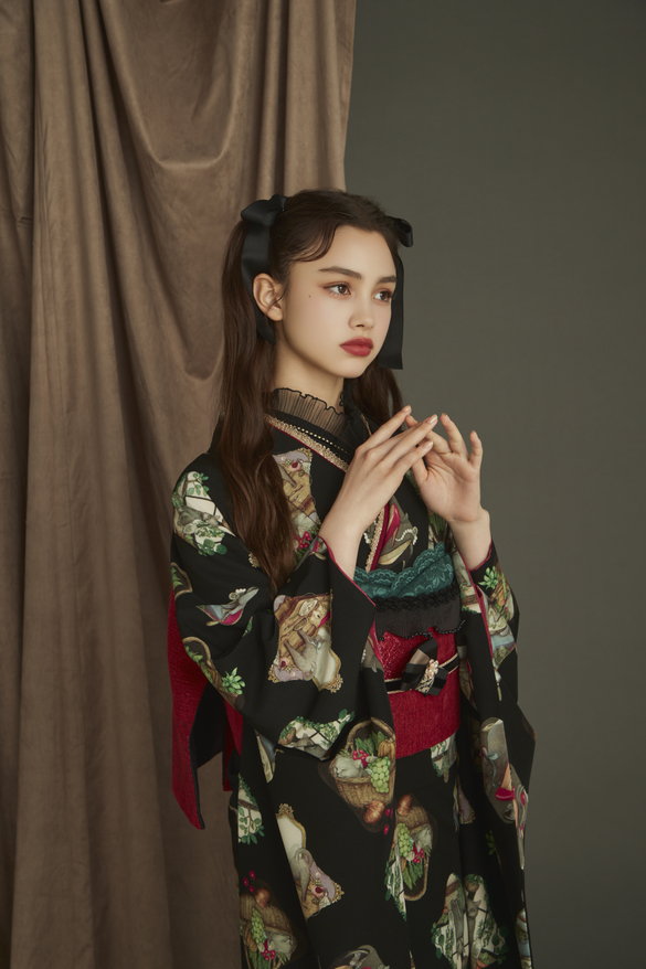 本日は黒地にアンティーク調に描かれ猫たちが愛らしい、振袖のご…