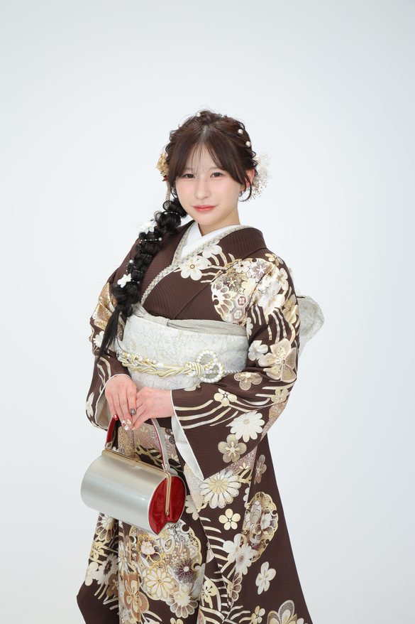 深みのあるブラウンをベースにした振袖は、落ち着いた中にも華や…