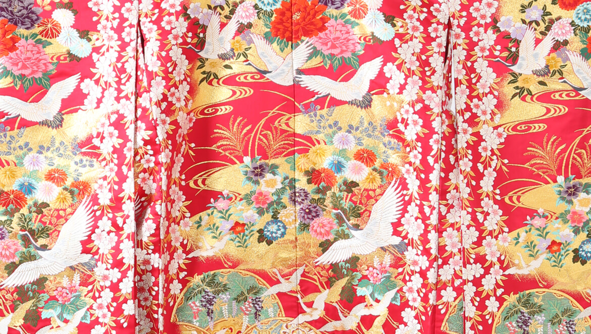朱の地色に羽ばたく「鶴柄」長寿の象徴として古くより愛されている吉祥柄です。