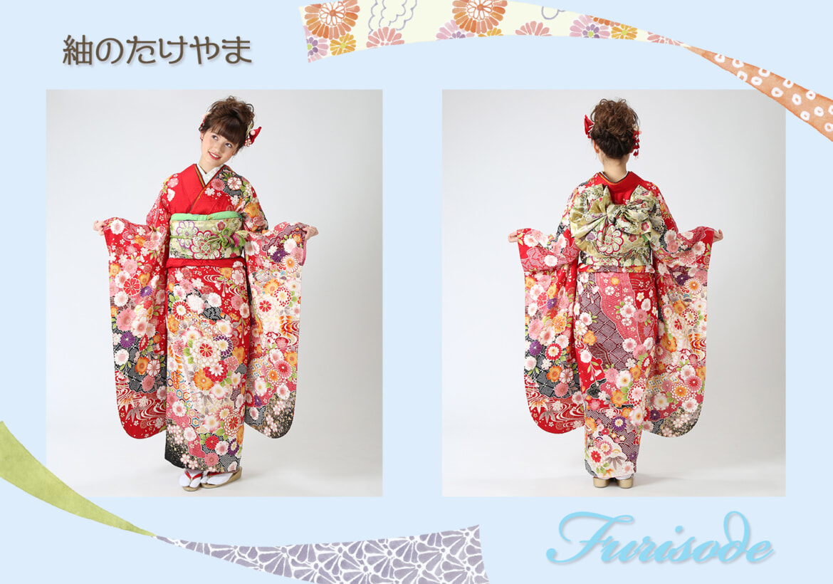 赤地に丸菊、桜・流水文様で全体に動きがあり情緒的で✿咲き誇る四季の花々が華やかに描かれた振袖です。柔らかい緑を差し色で瑞々しい出で立ちに♬