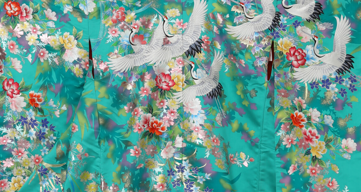 本日はエメラルドグリーン地に鶴文様の華やかな色打掛のご案内をいたします。