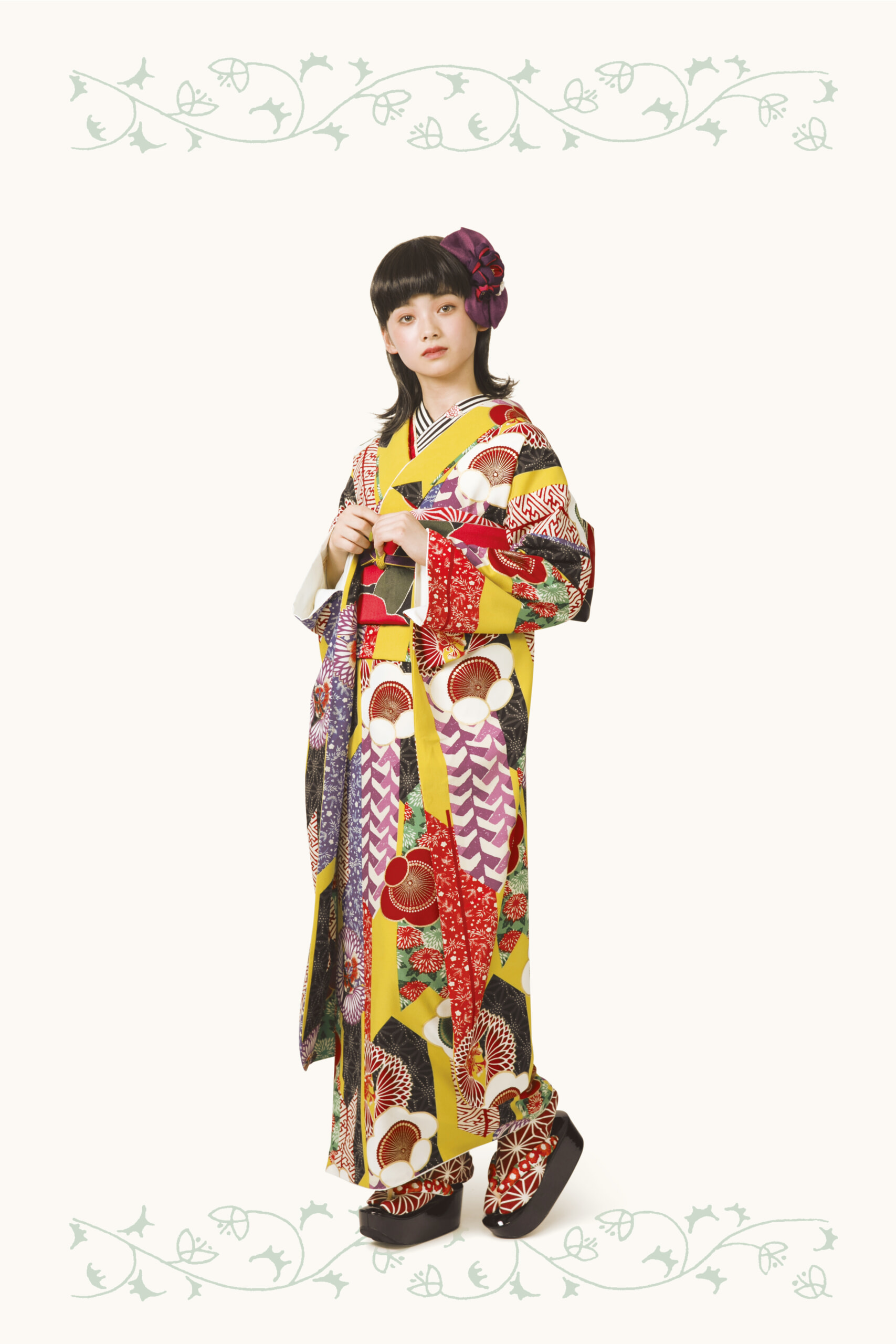 大胆華麗な鮮やかなビタミンカラーの黄色地にカラフルで可愛らしい花々で晴れの日に相応しい装いに。