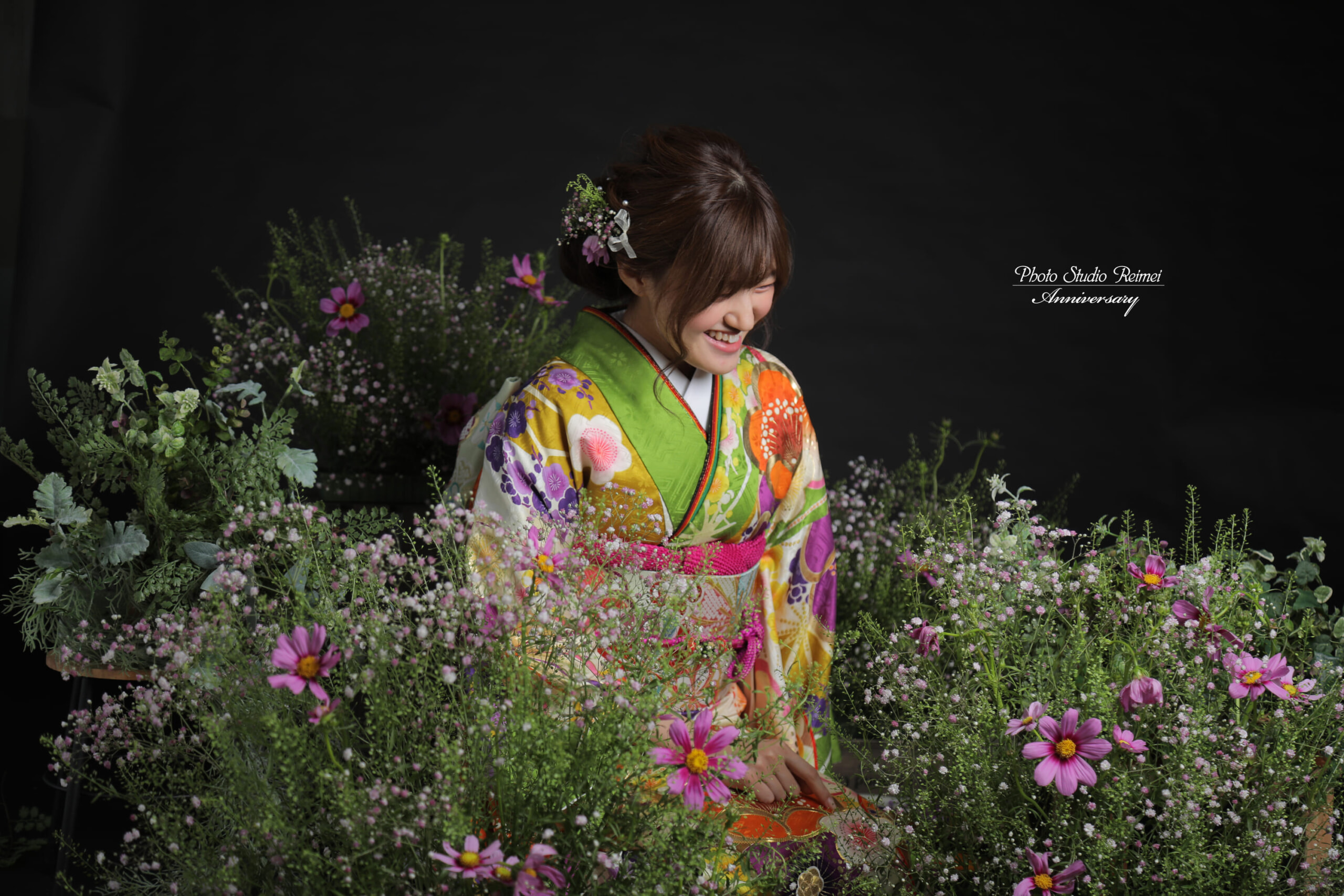 お振袖に合わせてアレンジしたお花を背景に