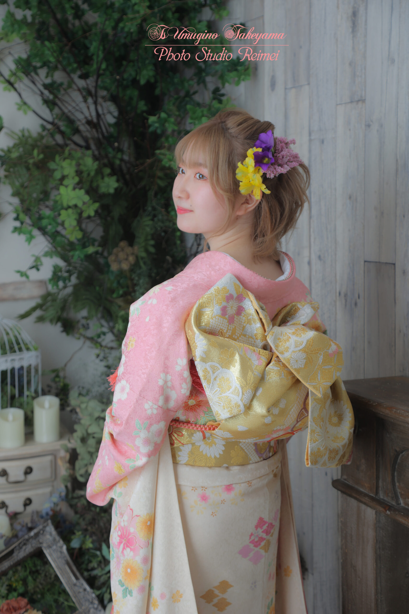 今回は可愛らしいお着物に明るい黄色と紫のお花を使わせて頂きました。