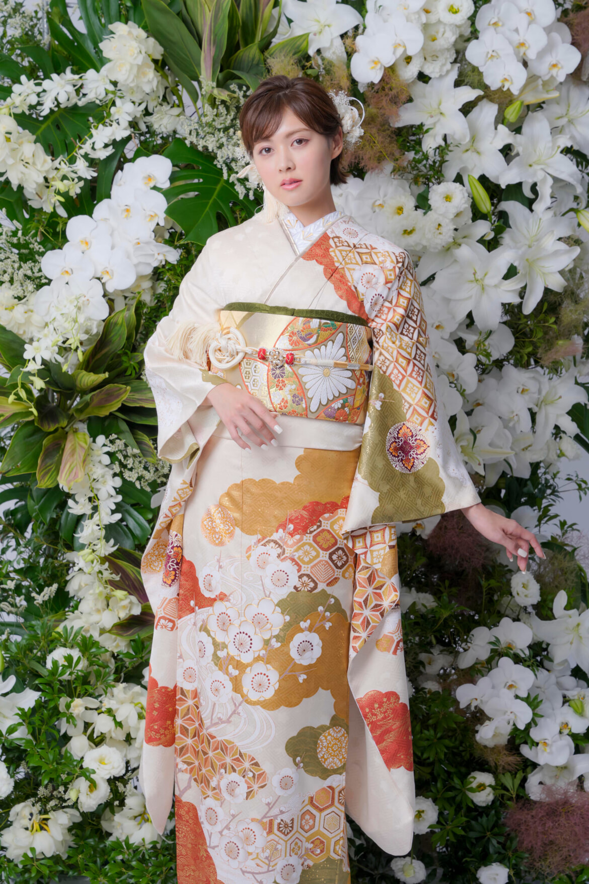白地に梅文様が淡い色合いに描かれていて、吉祥をあらわす瑞雲や流れるような流水文が晴れの日にふさわしいお振袖です。差し色に緑やゴールド系で上品に☆彡