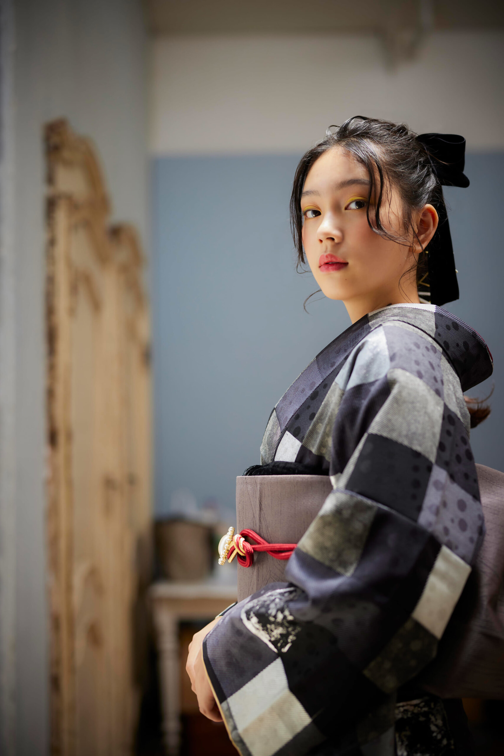 落着いたシックの色合いで格子柄と鶴文袖が左右非対称に描かれている振袖。差し色にエンジ系をポイントに~☆彡