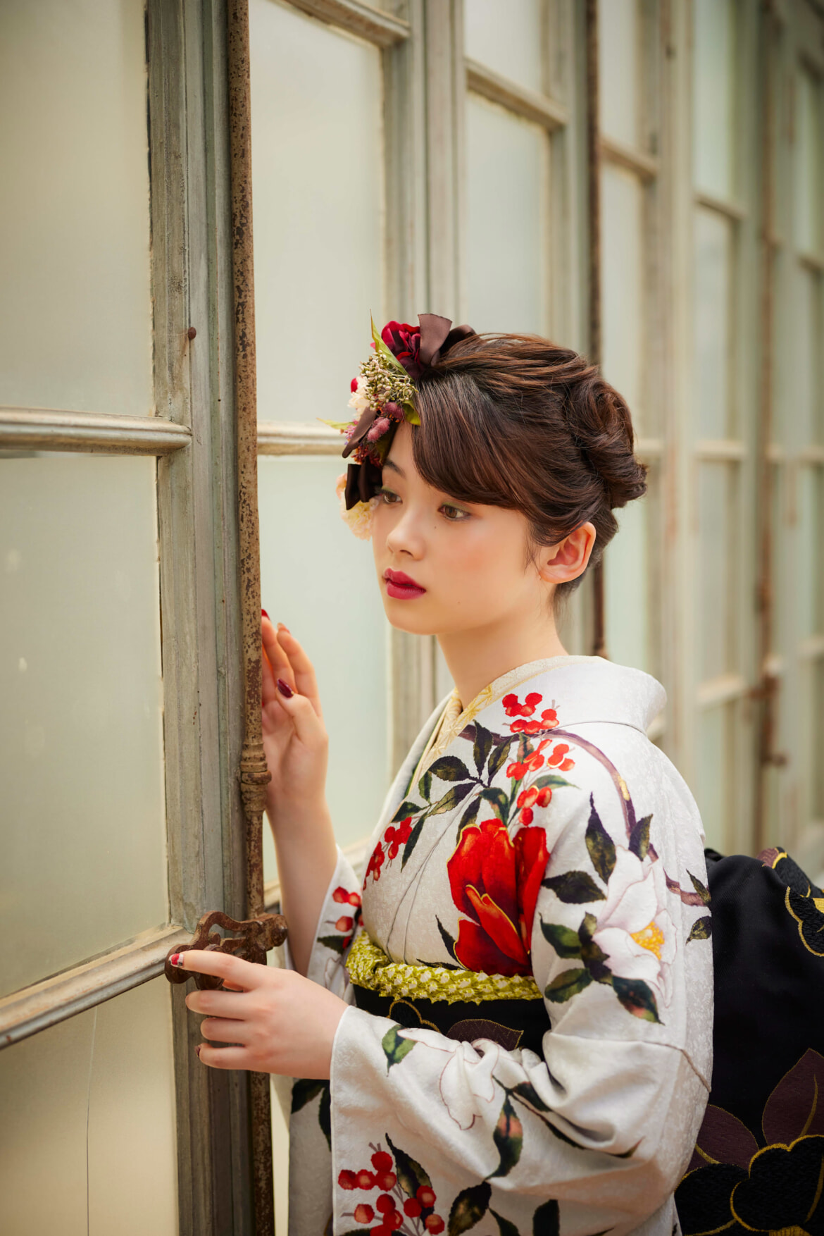 白地に赤の椿柄がパッと目を引いて白椿や南天柄が相まってアンティーク調に描かれた印象的な振袖。差し色に緑や若草色系で上品に☆彡