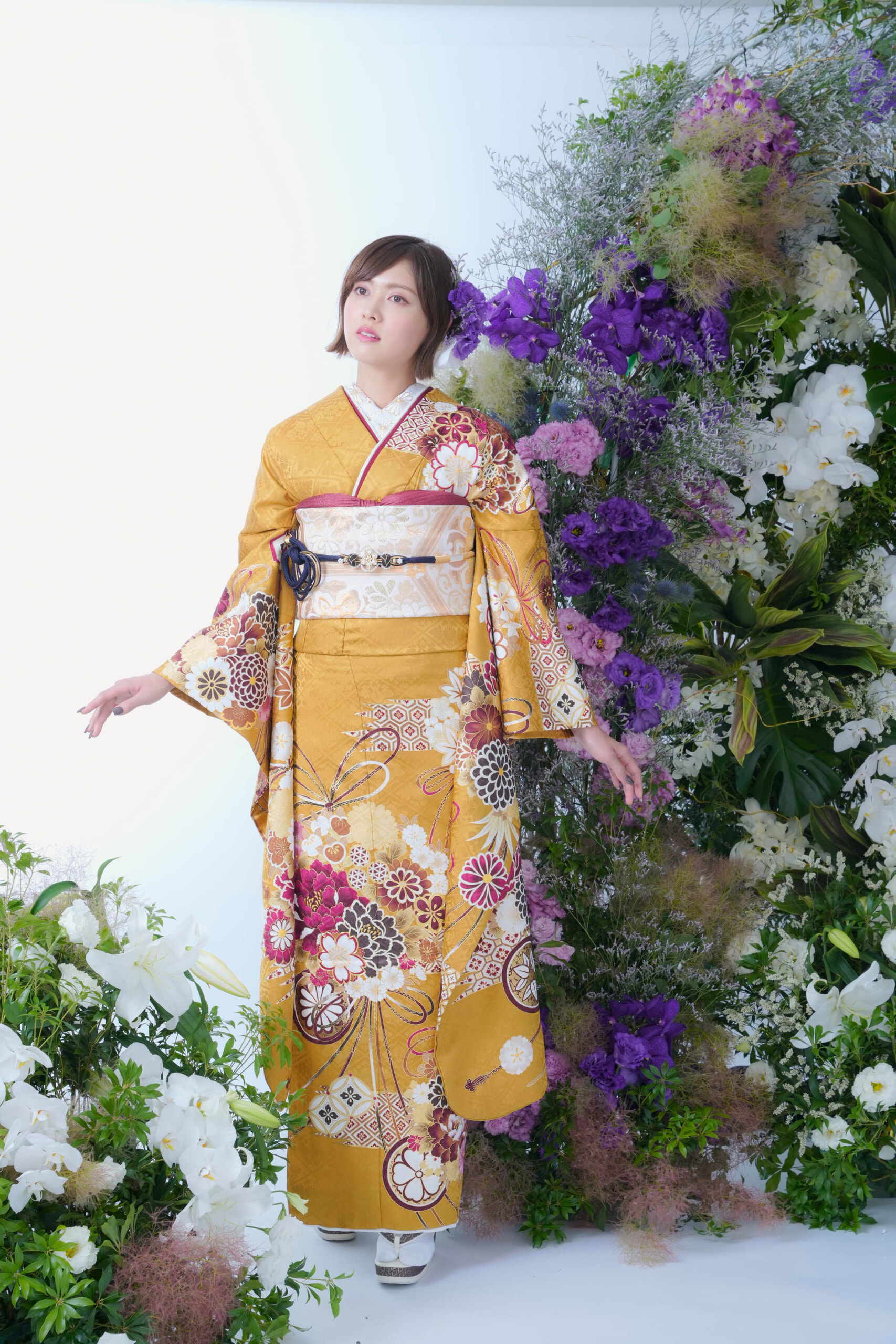 大人な雰囲気のからし色に、落ち着いたトーンの牡丹柄が印象的で華やかな振袖。差し色に赤紫や黒系で上品に☆彡