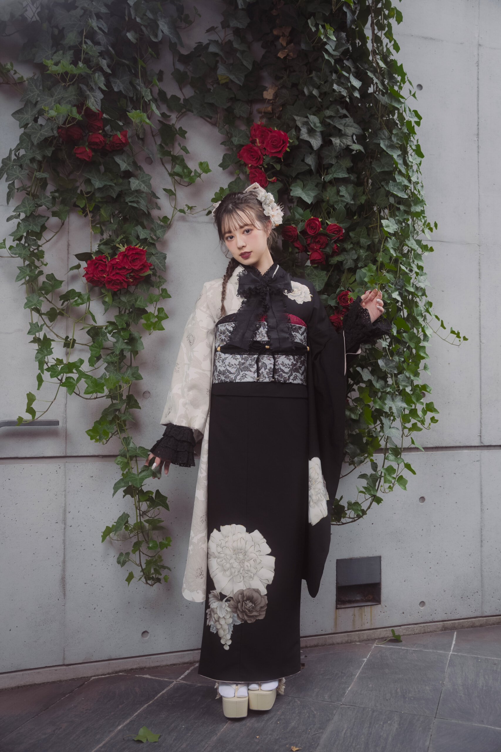 黒地にアンティーク柄がポイントで描かれて淡いベージュ色の花とアンティーク柄が左右で色が違う片身替わりは、もうそれだけでオシャレ上級者☆彡小物はレース調で揃えて、アクセントに赤を入れておしゃれな印象に(*˘︶˘*).。.:*♡