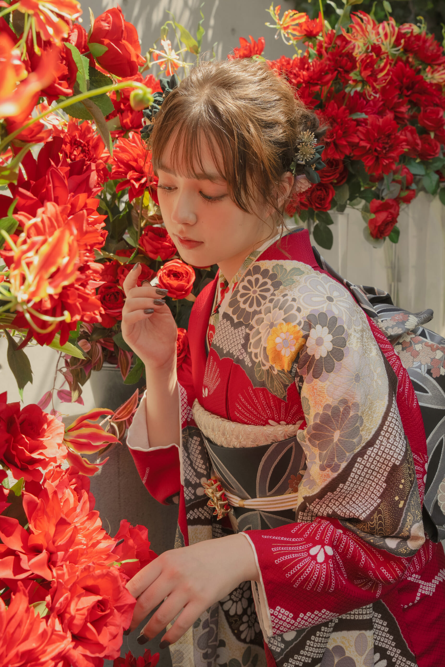 本日は赤地に華やかな花々が描かれた振袖のご案内です♪