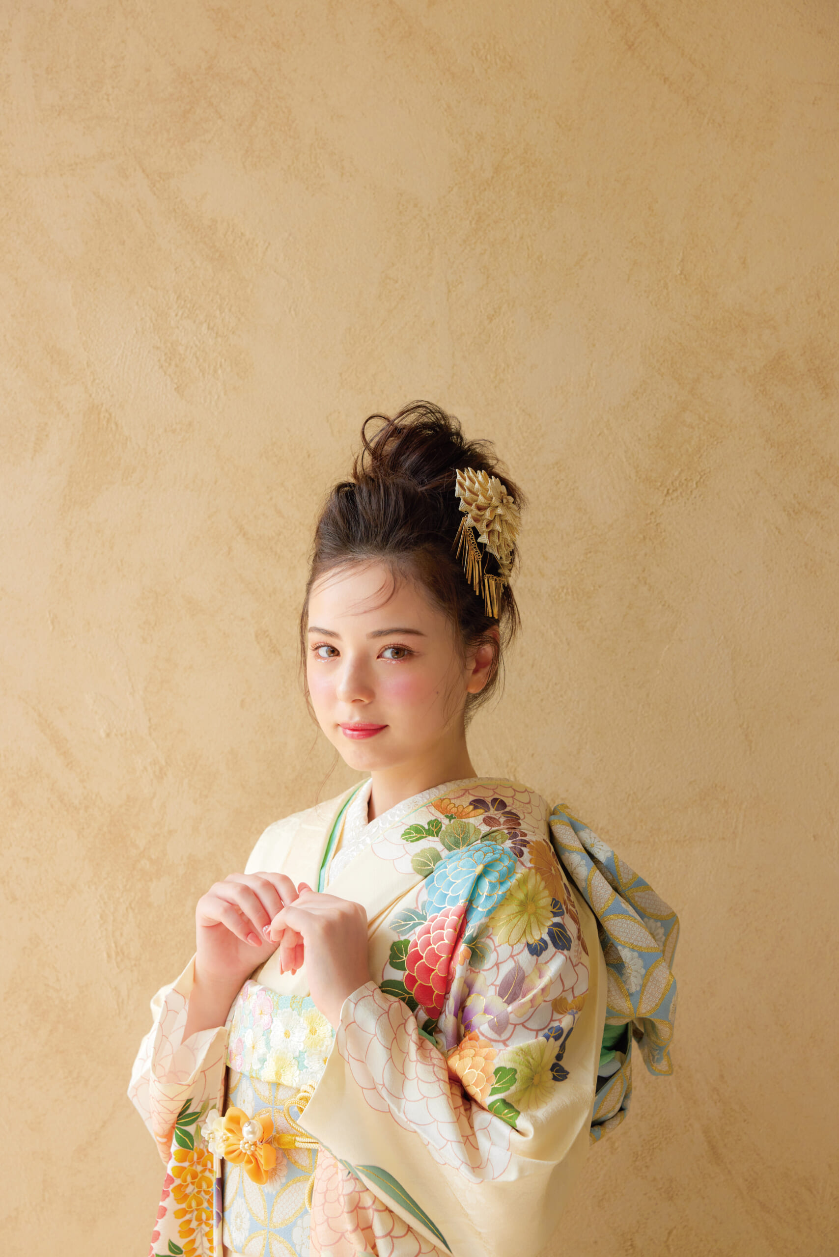 クリーム地に、藤やダリア菊、牡丹柄が上品な中にも愛らしい振袖、アクセントに小物は若草色や黄色で豪華な装いに☆彡