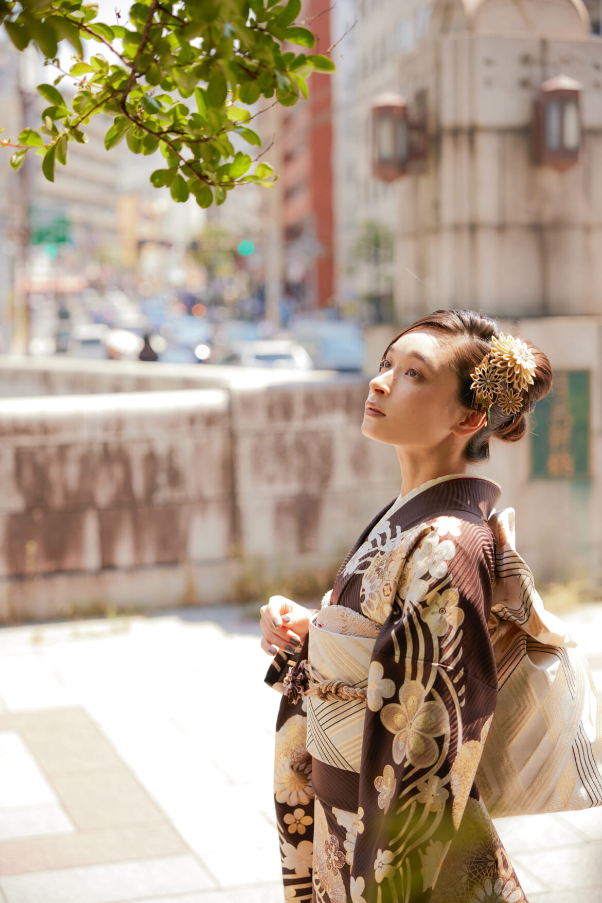 水色地にの四季折々の花々が描かれて流水が振袖に動きを与え、疋田模様と桜のコラボレーションは、まさに伝統と現代の融合♪桜が描かれた部分にはゴールドで縁取りされて、一層の豪華さを演出しています。