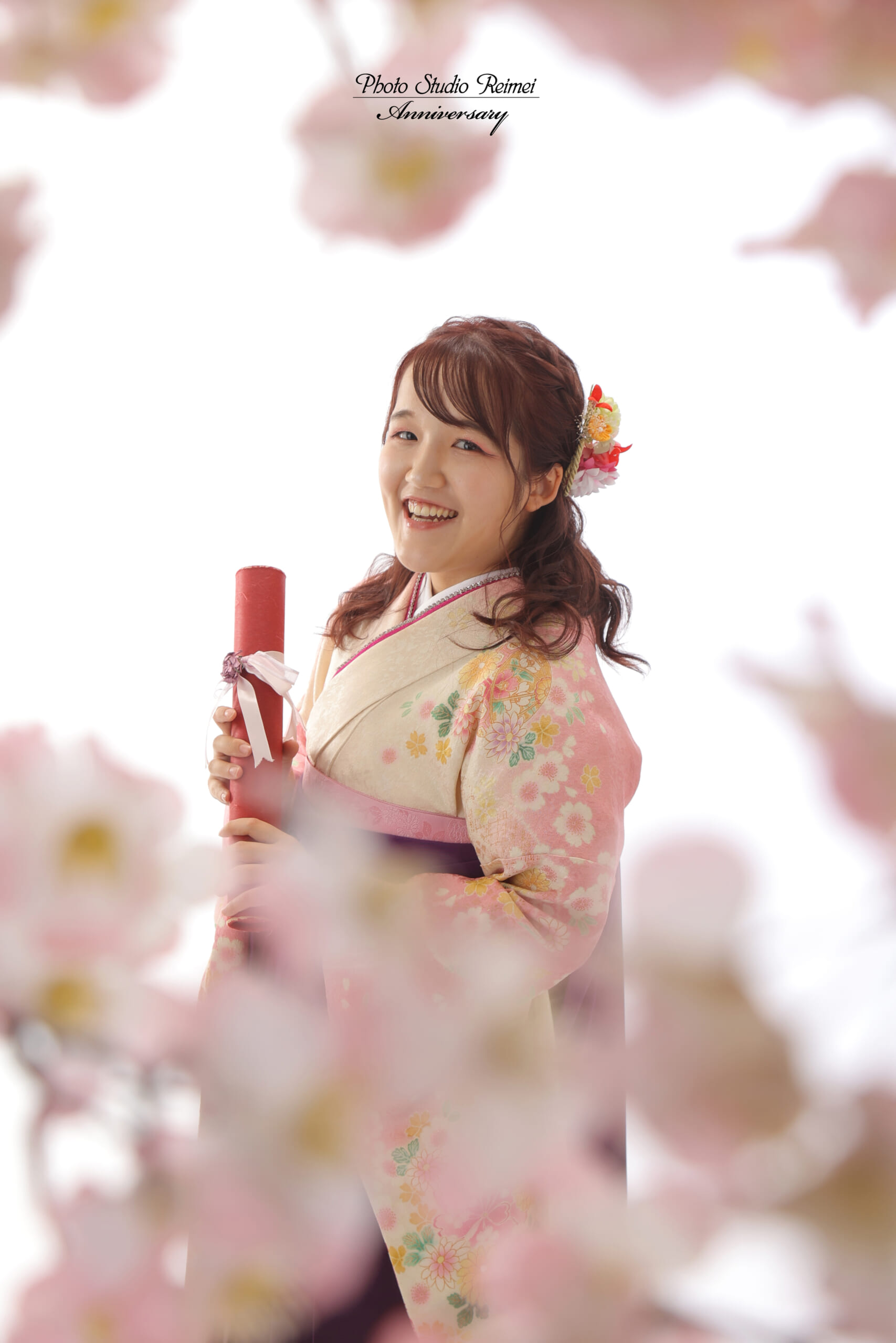 優しいピンクの振袖がとてもお似合いの素敵なお嬢様!繊細な花柄が春のような柔らかさを感じさせます。赤い和傘との組み合わせも可愛らしいですね♫