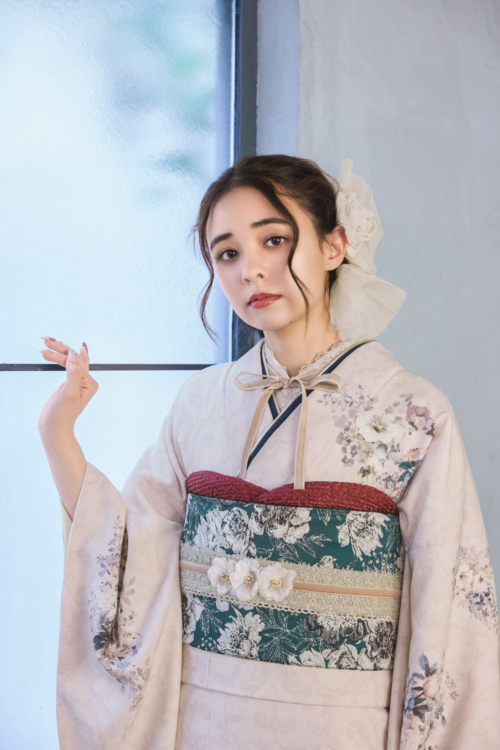 この振袖は、優雅でありながらも控えめなピンクベージュの地色が特徴。落ち着いたトーンが、大人の女性らしさを引き立ててくれます。そして、その上には、まるで時間を遡ったかのようなアンティーク柄が広がり、全体にクラシックな雰囲気を与えています。この振袖の最大の魅力の一つは、そのコーディネートの柔軟性です。ピンクベージュは、どんな帯や小物とも相性が良く、個性を出しやすい色です。