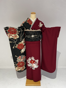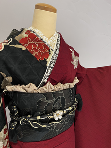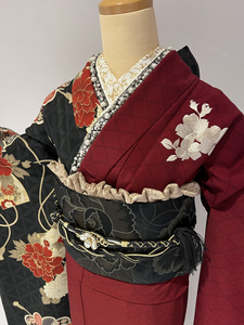 深みのある赤に黒地に大きく描かれた牡丹が特徴的な片身代わりのデザインが印象的な一着です。