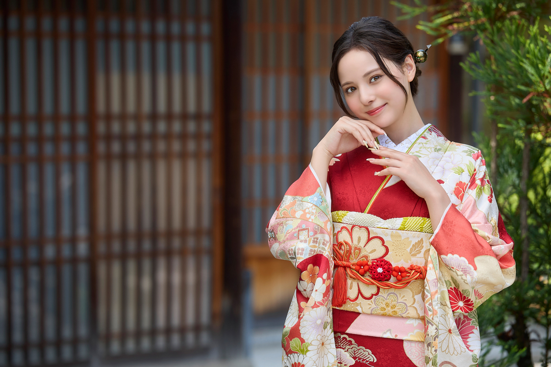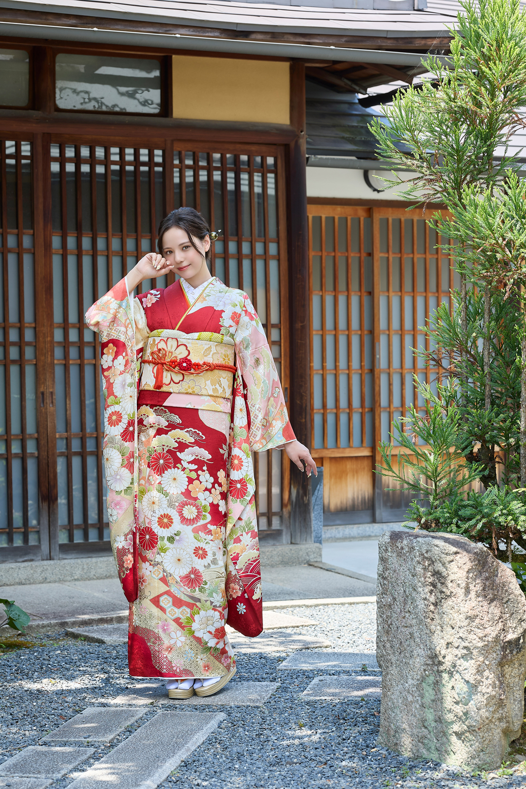 赤色の新作振袖、赤は日本では古来から魔除けや幸運の象徴とされてきた色で、成人式や結婚式などのお祝いの席にはぴったりなんです。振袖に描かれた牡丹は〝花の王様〟と呼ばれるだけあって、その存在感は圧倒的。大きく咲き誇る花びらが織りなす模様は、まるで着物の上で花園が踊っているかのよう。古典柄なのに全然古臭くないのは、現代の技術で表現された繊細な色彩のグラデーションがあってこそ。