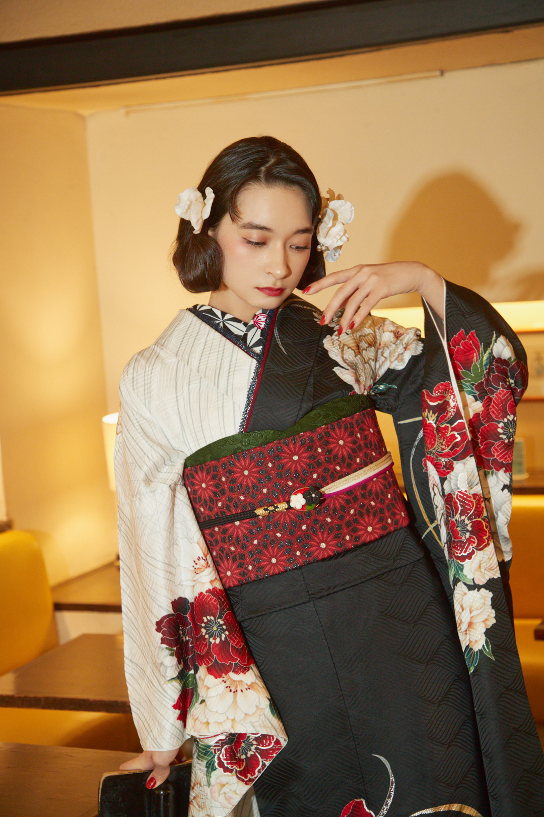 牡丹は古くから〈花の王〉と呼ばれ、富貴や高貴さの象徴とされてきました。その豪華絢爛な花びらは、女性の美しさと気品を表現するのにこれほど相応しいモチーフはないでしょう。