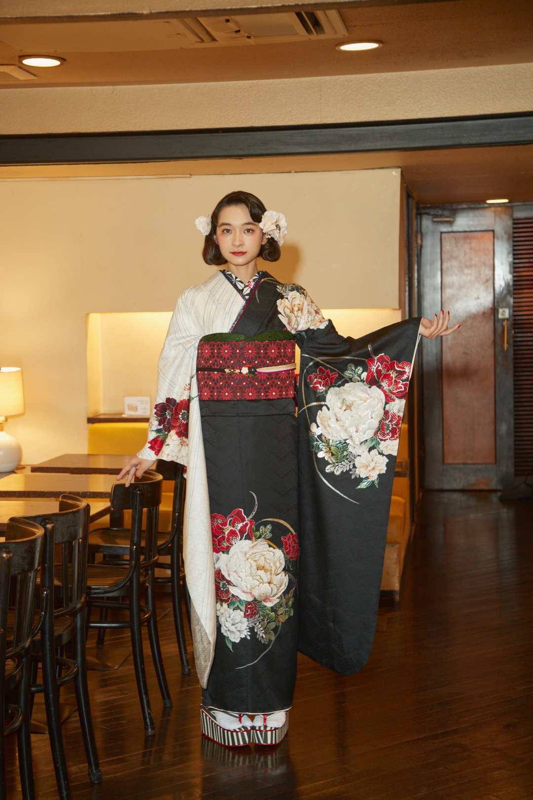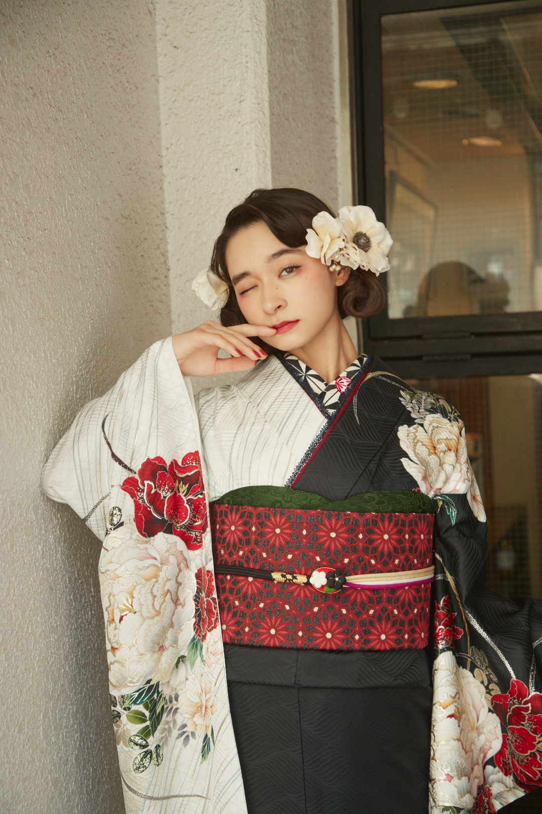 白と黒という究極のモノトーンに、気品あふれる牡丹の花が咲き誇るこの一枚は、まさに現代の女性にぴったりの洗練された美しさを表現しています。