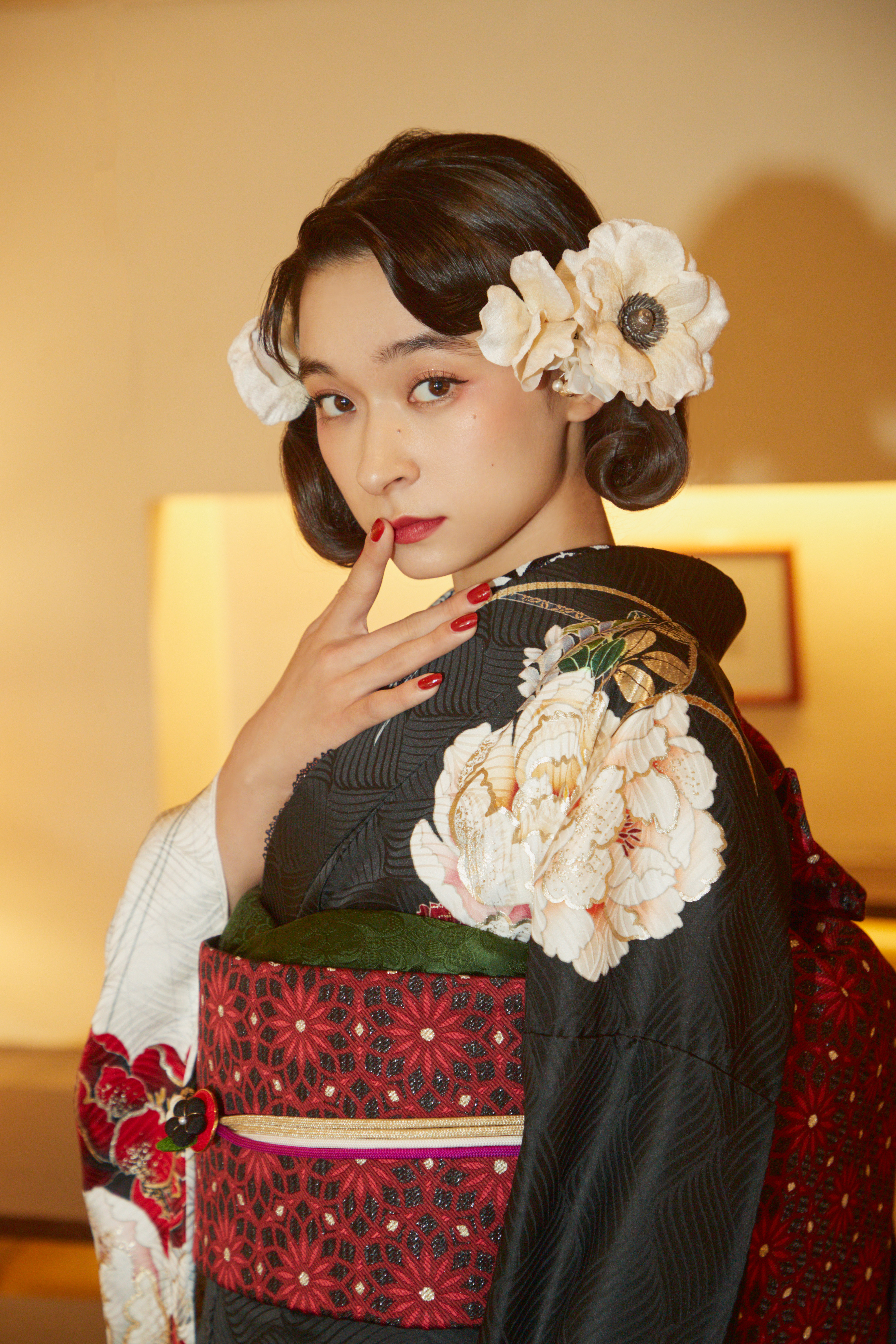 牡丹は古くから〈花の王〉と呼ばれ、富貴や高貴さの象徴とされてきました。その豪華絢爛な花びらは、女性の美しさと気品を表現するのにこれほど相応しいモチーフはないでしょう。