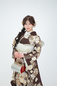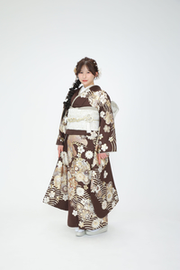 深みのあるブラウンをベースにした振袖は、