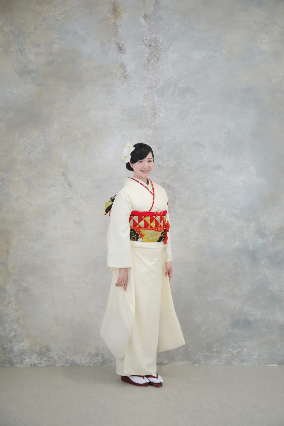この振袖は、全体的に落ち着いた色合いが特徴のため、髪飾りや帯には少し華やかな色を取り入れることで、バランスを取るのがポイントです。また、ゴールドやシルバーの帯締めを使用することで、上品さを引き立てつつも華やかさをプラスすることができます。