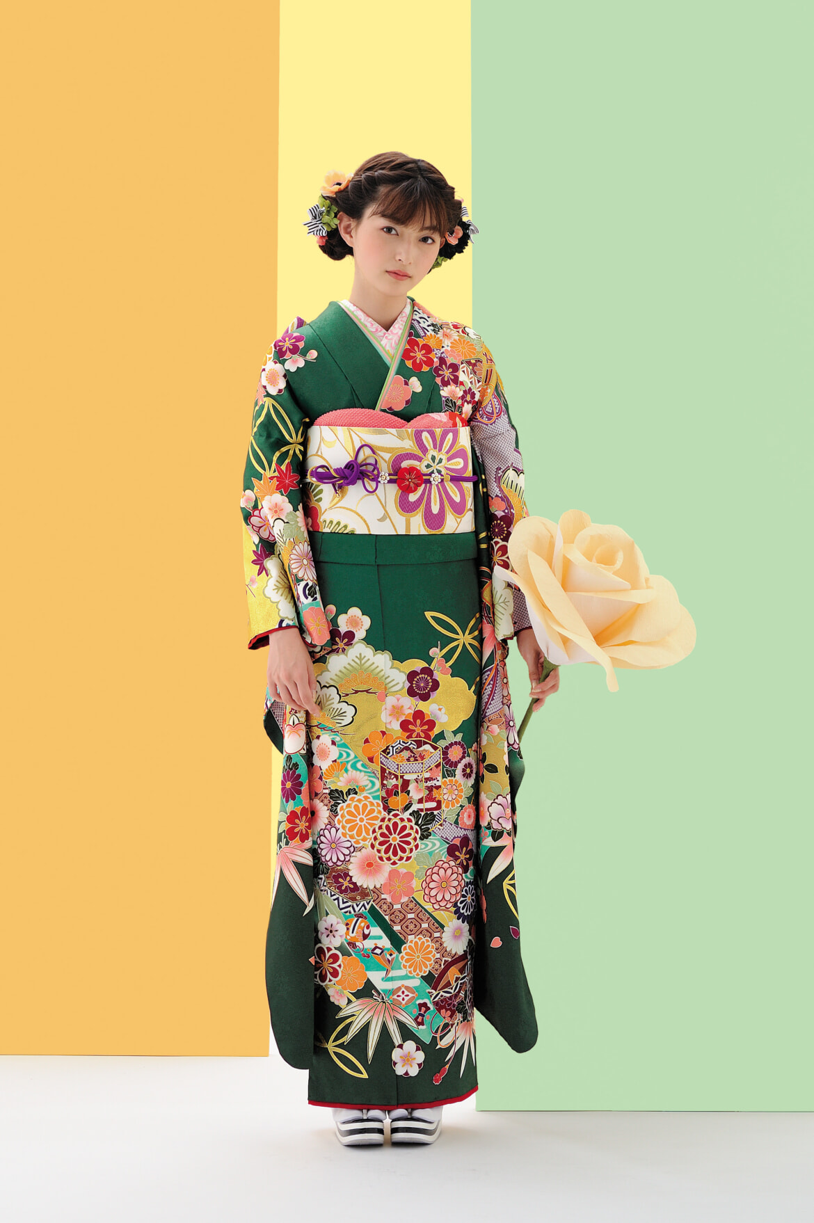 本日はBloom”ブルーム”より古典柄・緑地の色鮮やかなお振袖をご案内を致します。