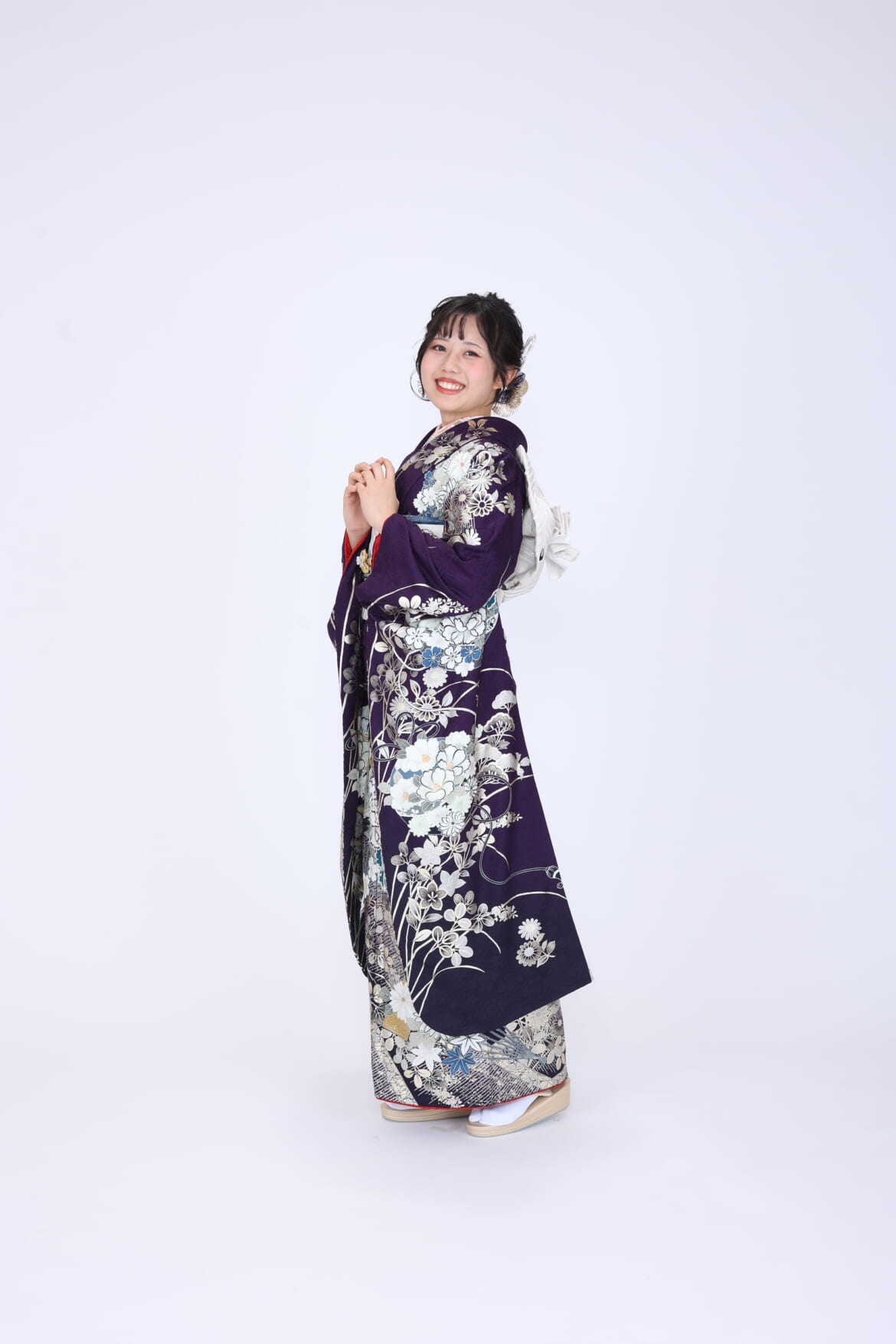 古典的でありながら現代的な着物を好む方には、牡丹の花が描かれたこの振袖がおすすめです。牡丹は、その豪華さと美しさから「花の王」とも称され、縁起の良い花として知られています。また、紫は高貴さと深い精神性を象徴し、着る人の品格をさらに高めてくれる色です。
